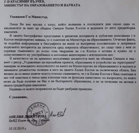 В качеството си на временно изпълняващ длъжността кмет на община Свищов и заместник-кмет намирам за неморално използването на името на Министерството на образованието и науката и заеманата длъжностна позиция в него на лицето Калин Костов за политическа облага. Бих желала да се внесе повече яснота относно съмнението, че г-н Калин Костов е Ваш съветник и ако той наистина е такъв нека използва тази си функция единствено по въпросите, по които може да бъде полезен на Вас и на българското образование, а не за печелене на активи в своята предизборна кампания.