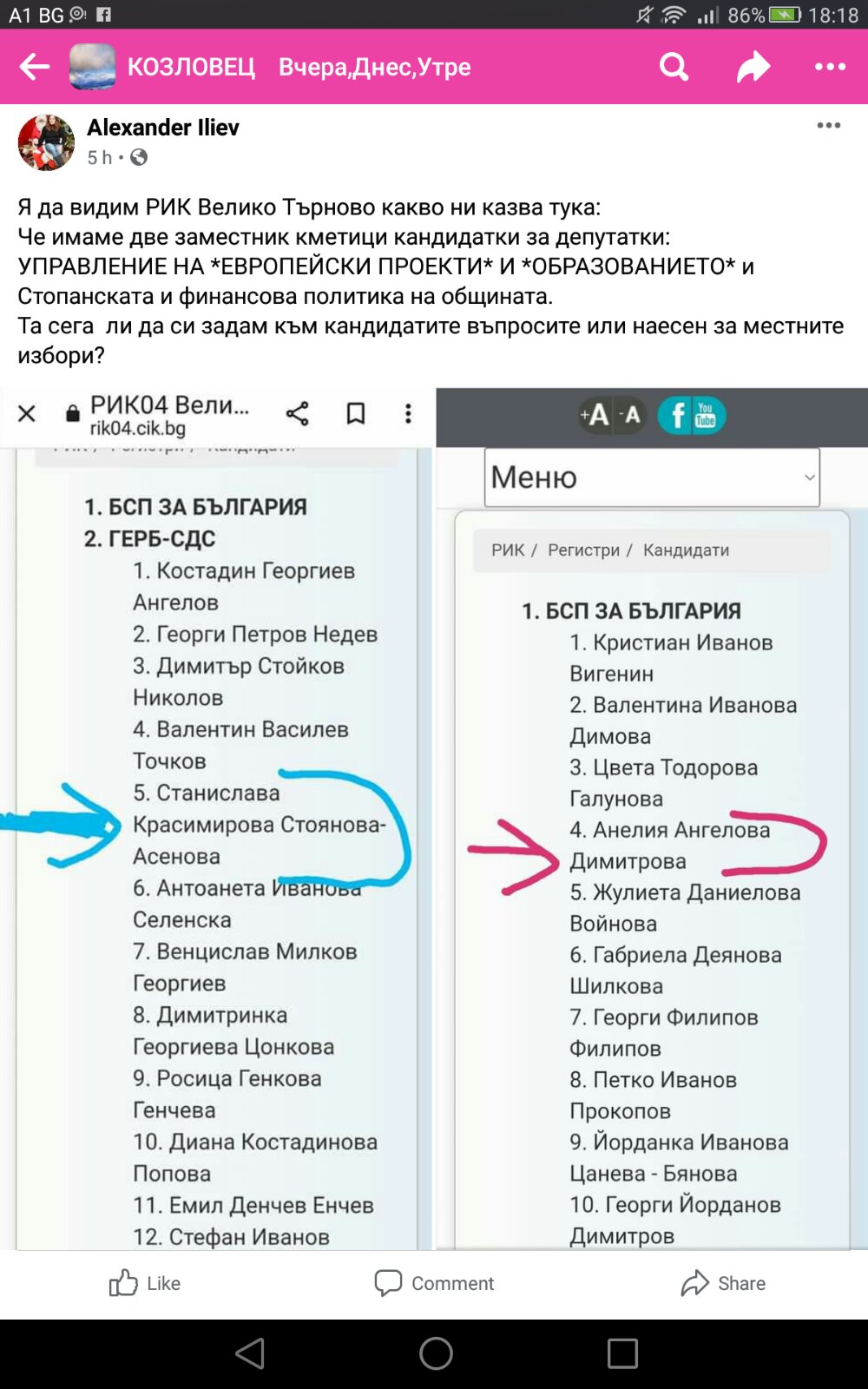 Така например в публикация на Александър Илиев в групата на с. Козловец той риторично пита „сега ли да си задам към кандидатите въпросите или наесен?“, а коментарът му е придружен със снимка на регистрираните листи на ГЕРБ и БСП в РИК – Велико Търново.